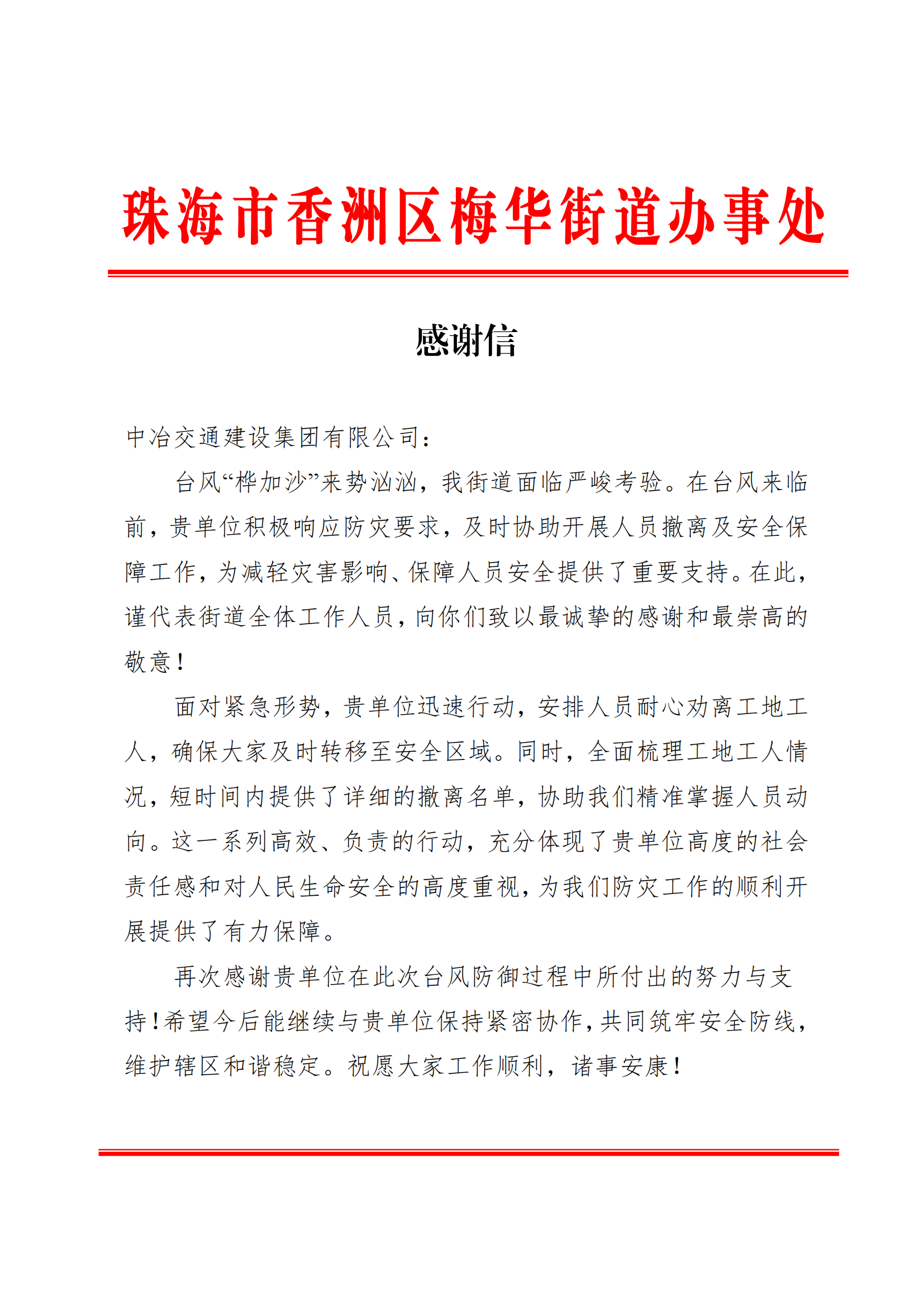 近日,因為積極響應地方政府應對臺風“樺加沙”防災要求,及時協助開展人員撤離及安全保障工作,廣南梅第二條原水管道工程一期項目收到珠海市香洲區梅華街道發來的感謝信。