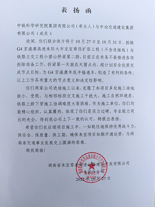 表揚信中指出,中冶交通聯(lián)合體承建的鐵路立交工程小碧山橋梁第二跨拆除工作于10月27日啟動。施工首日,項目團隊在有限的天窗點內(nèi)安全、優(yōu)質(zhì)、高效地超額完成節(jié)點目標,為G4京港澳高速實現(xiàn)2025年底半幅通車的重大節(jié)點奠定了決定性基礎。